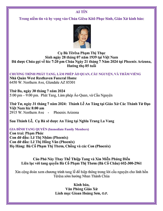 Cáo phó: Cụ bà Têrêsa Phạm Thị Thục (1939-2024)