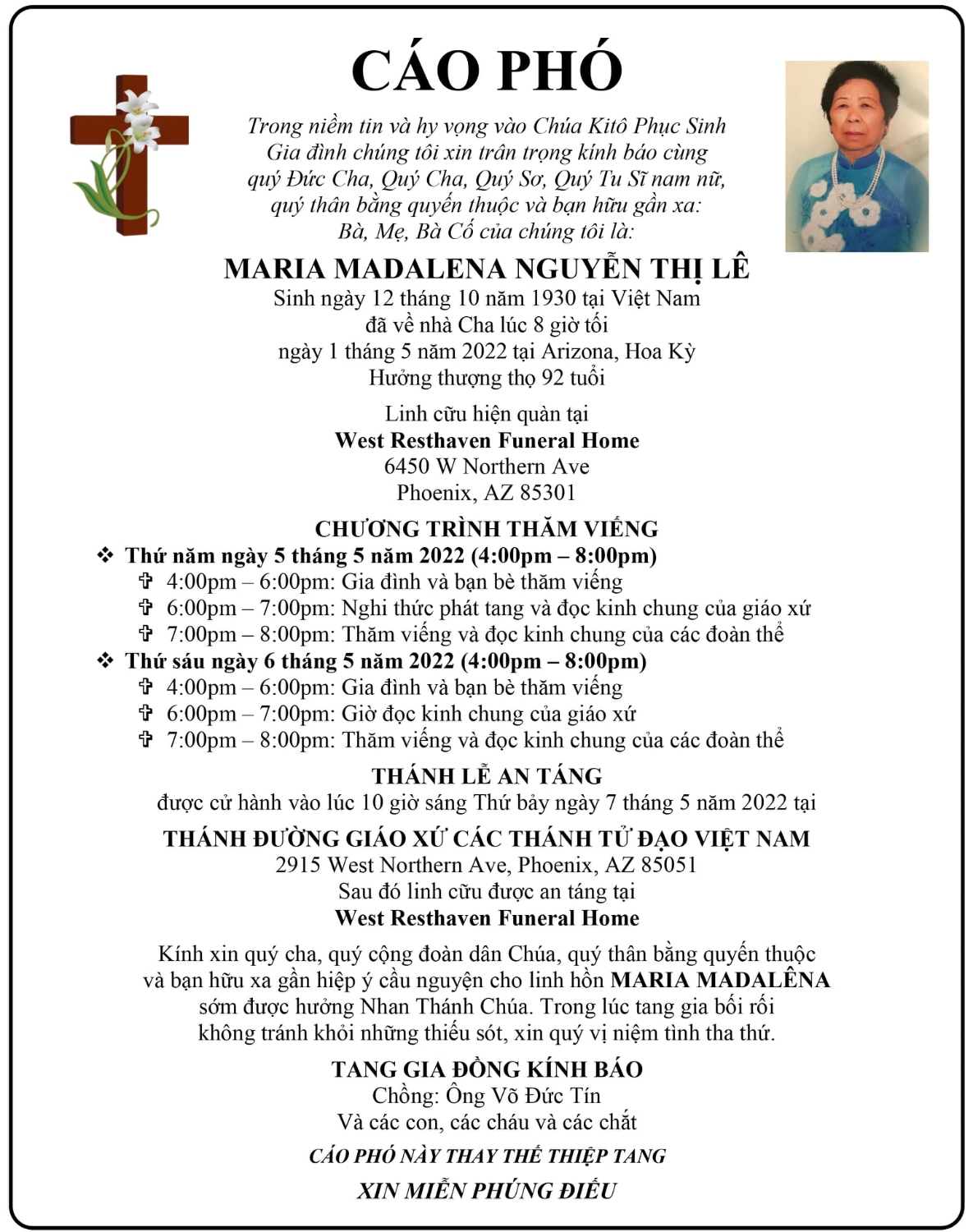 Cáo phó: Maria Madalena Nguyễn Thị Lê (1930 - 2022)