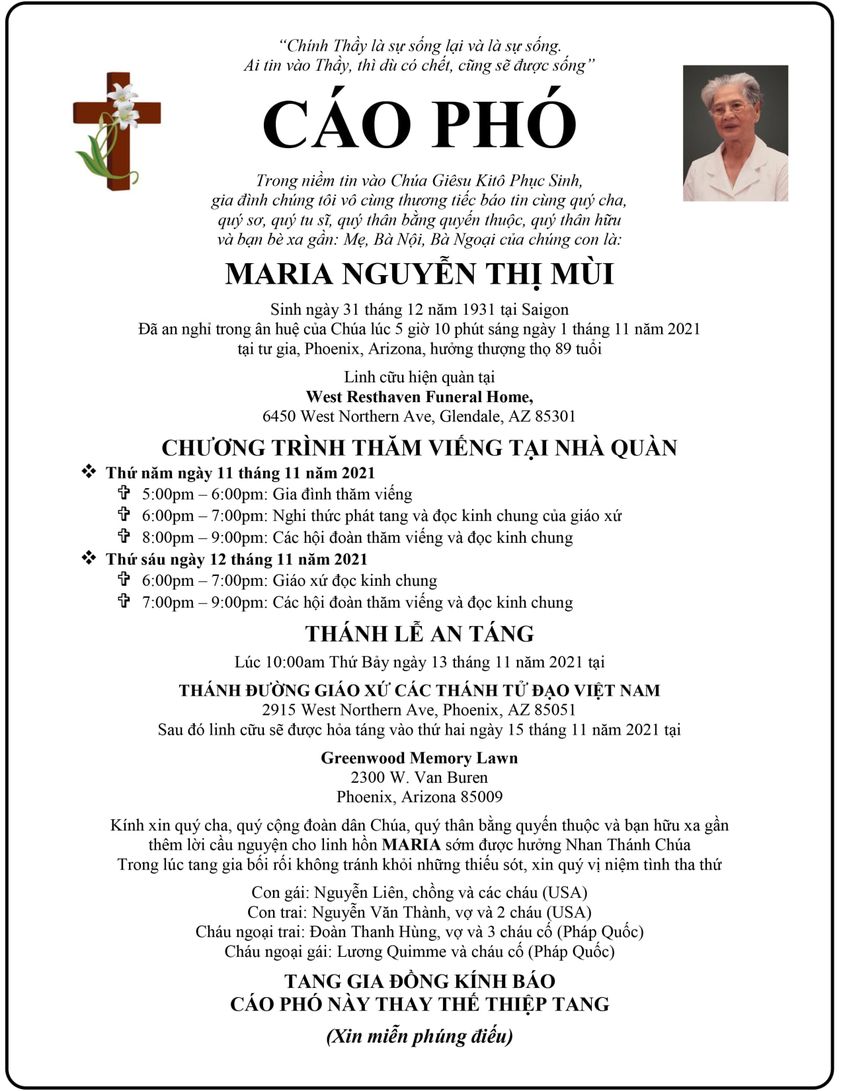 Cáo phó: Maria Nguyễn Thị Mùi (1931-2021)